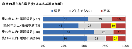 睡眠不満と寝室の音環境の満足度について調べたところ、全年代の「不満層」で音をうるさく感じる人が多く、「外部の音がうるさい」では中年の「不満層」が53%だった。温熱環境(家全体、寝室)についても、「不満層」全体で不満が多く、「寝室の温度」は中年の「不満層」で31%だった。また、「不満層」の中でも築20年以上の住宅に住んでいる人は、温熱の不満割合が30%と高い傾向にあった。