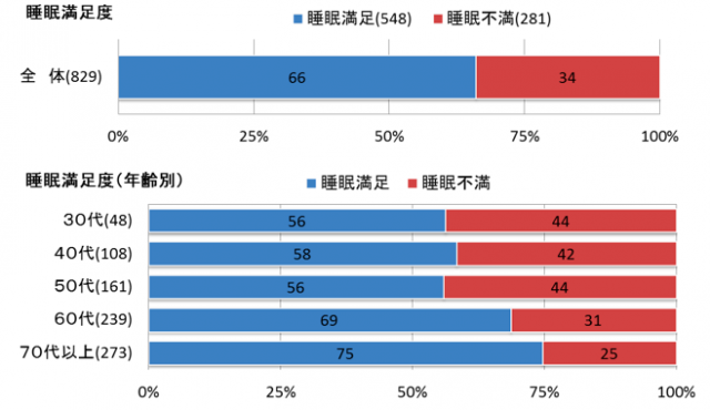 睡眠の満足について調査したところ、睡眠に満足している「満足層」は66%、不満を感じている「不満層」は34%だった。年齢別では、中年層で睡眠不満が高く、30代、40代、50代それぞれで4割を超える数値となった。