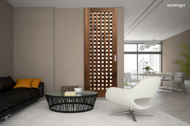 「ゼンスタイル」。今回の見本市に照準を合わせて開発したドアで、黄金比率を用いた格子組みデザインが特徴。「突き板の加工に日本の技術力の高さを感じてもらえるはず」(同社)。
