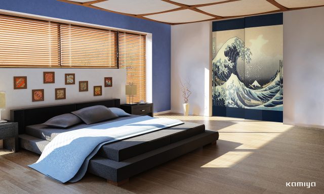 「F/S(エフエス)」浮世絵バージョン。「エフエス」は素地のまま出荷し、好みに応じてクロスや黒板シートを貼ったり、絵をペインティングできるオリジナル性を表現できるドアで、2010年から発売する隠れた人気商品。今回は葛飾北斎や喜多川歌麿の浮世絵を塩ビクロスにプリント、引戸に貼った。