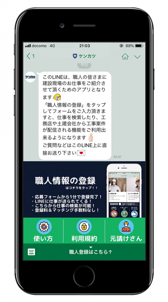 同サービスは、LINEと連携した業務管理システムで、書類や電話などのやり取り不要で職人の手配業務を完了させることができるサービス。