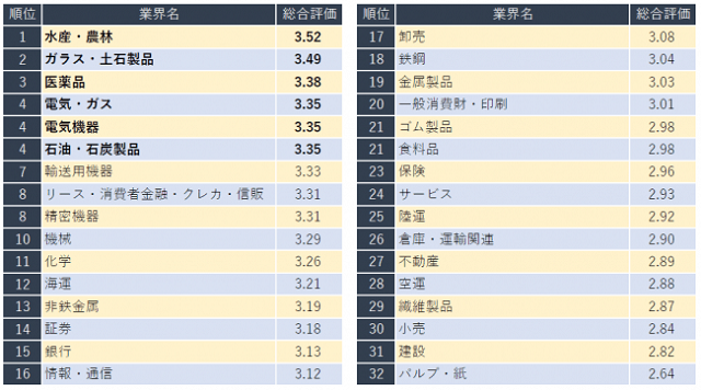 2位の「ガラス・土石製品」で評価が高かったTOTOは、女性社員の活躍推進に積極的に取り組むなど、上位の業界では各企業がスキルアップの環境づくりや勤務時間、育児休業取得等に配慮していることがわかった。しかし、1位から10位までの総合評価の差はわずか0.23点であり、業界による差というより、企業による差が大きいといえる。