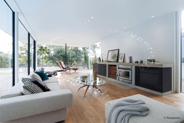 従来製品は1灯で12畳、2灯で12〜18畳に対応していたが、「より広い空間に設置したい」というニーズに応えて4灯まで接続可能にした。これにより、3灯で18~27畳、4灯で27~36畳の空間でも音がしっかり広がる。広いリビングダイニングをはじめ、カフェや美容院などの店舗にも適するという。