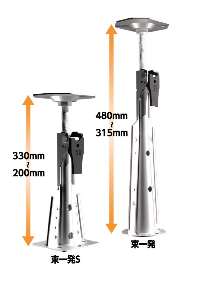 サビにつよいZAM鋼板製で、最大圧縮荷重は14.0kN。大引の沈み込み量は従来の鋼製束の約2分の1に抑えることができるという。 土間への固定に接着剤を使い、ビスを不要にしたことで手間を省略。レバーを半分押し下げて高さを微調整し、さらに押し下げてロックすれば施工が完了する。1カ所あたりの作業時間は約10秒。