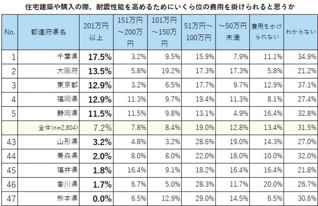 「実際に住宅建築や購入の際、耐震性能を高めるためにいくら位の費用を掛けられると思うか」との設問では、最も高い選択肢の「201万円以上」が7.2%だった。「201万円以上」を選んだ割合が高かった都道府県は、「千葉」(17.5%)、「大阪」(13.5%)、「東京」「福岡」(ともに12.9%)の順だった。