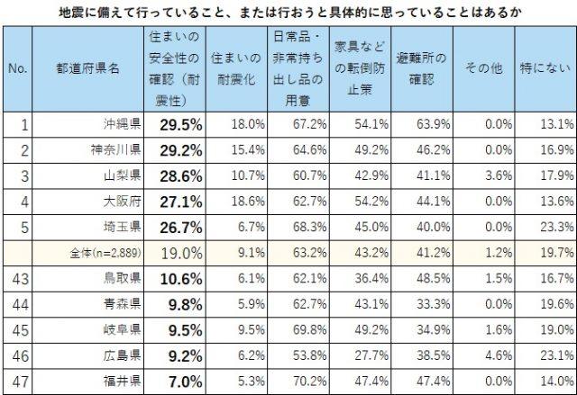都道府県別の回答率をスコア化し、各設問のスコアを合計した「耐震県」の総合ランキングでは、2位以下に「岩手」、「兵庫」、「宮城」、「青森」と東日本大震災や阪神淡路大震災の被災地域がランクインするなか、関東の「神奈川」が耐震の認知・理解などを示す「住宅の耐震意識」や「地震への備え」で高いスコアを記録し「耐震県」総合1位となった。下位県は45位「京都」、46位「島根」、47位「広島」だった。