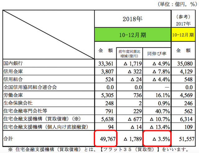 住宅金融支援機構(東京都文京区)は3月25日、2018年10~12月期の業態別の住宅ローン新規貸出額と貸出残高を発表した。主な機関等の住宅ローン新規貸出額は、前年同期比3.5%減の4兆9767億円だった。