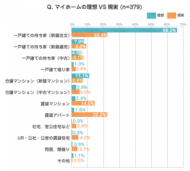 インタースペース(東京都新宿区)は3月26日、同社が運営するママ向け情報サイト「ママスタジアム」にて、子どもがいる母親379人を対象に行った「マイホームに対する意識」調査の結果を発表した。「理想のマイホームは持ち家か賃貸か」を聞いたところ、74.1%が「持ち家」と回答。このうち「戸建ての持ち家(新築注文住宅)」を理想とするママは66%だったが、現実は22.4%とギャップがあることがわかった。一方、家族のライフスタイルに合わせて「賃貸と持ち家を臨機応変に」と考えている人は21.4%だった。