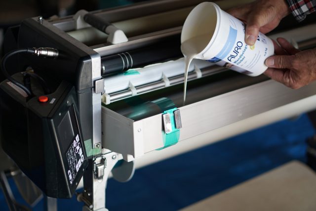 使用成分は、有機顔料、天然ゴム、ロジンエステル樹脂、亜麻仁油、ミルクカゼインなどほぼすべてが天然原料。独・AURO社は、基本的に天然原料のみで製品製造を行うが、今回の接着剤はドイツ政府の規制により0.3%の合成防腐剤(食品添加物)を含む。