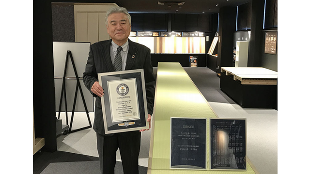 大建工業(大阪市)は、同社岡山工場の操業60周年記念イベントとして作製した全長11.71メートルの長尺畳(製品名:ダイケン畳)が、「最も長い畳(Longest tatami mat)」のギネス世界記録に認定されたことを発表した。