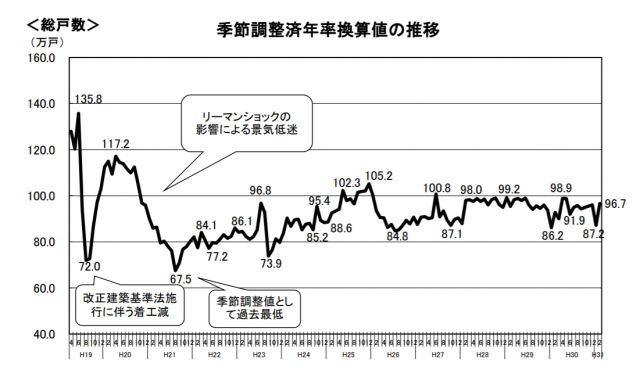 国土交通省が3月29日発表した2月の新設住宅着工戸数は、前年同月比4.2%増の7万1966戸だった。貸家は減少したが、持家と分譲住宅が増加したため全体で増加となった。季節調整済み年率換算値は、96.7万戸で前月比10.9%増と大きく増加したが、これは先月が87.2万戸と低水準だったための反動も影響しているとみられる。