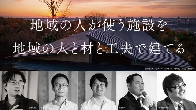 設計事務所SWING(大阪市西区)共同代表の金山大氏と小泉宙生氏、コアー建築工房(大阪府堺市)の千原徹氏、同協議会代表理事・相羽健太郎氏、新建新聞社社長・三浦祐成が登壇する。