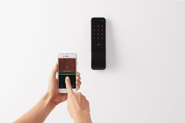 賃貸物件用のカギに特化した完全固定式スマートロック。入居者へのカギの受け渡しが要らず、カードやスマホアプリ、暗証番号で解錠・施錠を行う。