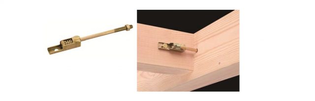バネの反発力を利用し、取り付け時はバネが縮んだ状態にしておき、木の収縮が進むとバネが元に戻ろうとする力で六角ボルトの頭を押し上げて木材と座金の隙間を埋める。