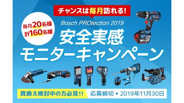 ボッシュ(東京都渋谷区)は、同社のプロ用電動工具の安全性を実感できる「ボッシュ・プロテクション~安全実感モニターキャンペーン」を実施する。応募期間は4月8日~11月30日。今回が3回目の開催となる。