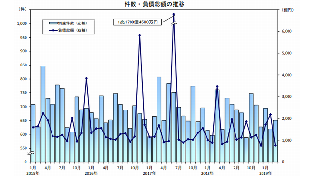 集計対象は、負債1000万円以上の法的整理による倒産。