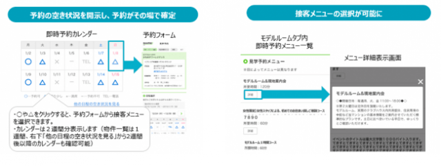 「モデルルーム即時予約」機能は、モデルルームの見学予約をその場で確定できるもので、「夜間は電話予約ができない」「直前の予約ができない」などの不便さを解消する。また、モデルルーム見学の際の所要時間や内容を、予約時にメニューとして選べるようになった。