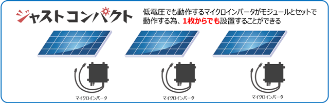 低電圧でも動作するマイクロインバータが太陽電池モジュールとセットで動作するため、パワーコンディショナは不要で太陽電池モジュールを1枚から方位に関係なく設置することができるのが最大の特徴。