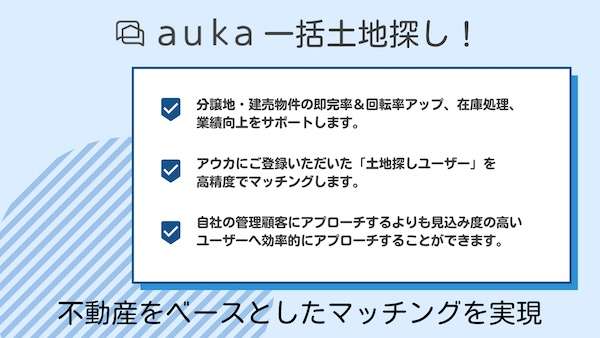 ギバーテイクオール(東京都港区)は、住宅購入検討者と住宅会社をつなぐオンライン特化の相談サービス「auka(アウカ)」を本格展開する。住宅購入検討者の利用料は無料で、住宅会社が成約件数に基づいて手数料を払う。2018年から熊本県に特化して展開してきたサービスを全国対応させる。