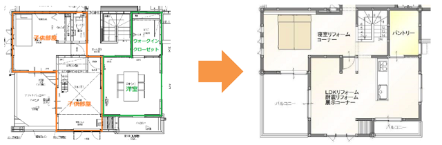 桧家住宅が高崎並榎展示場で活用していたショールームの一部をリフォームしたもので、実際のリフォーム事例を体感・比較することができる。子供部屋2部屋とトイレスペースを、間取りを変更し高級感のある寝室とLDKに改装。また、洋室とウォークインクローゼットをキッチンとパントリーにリフォームした。