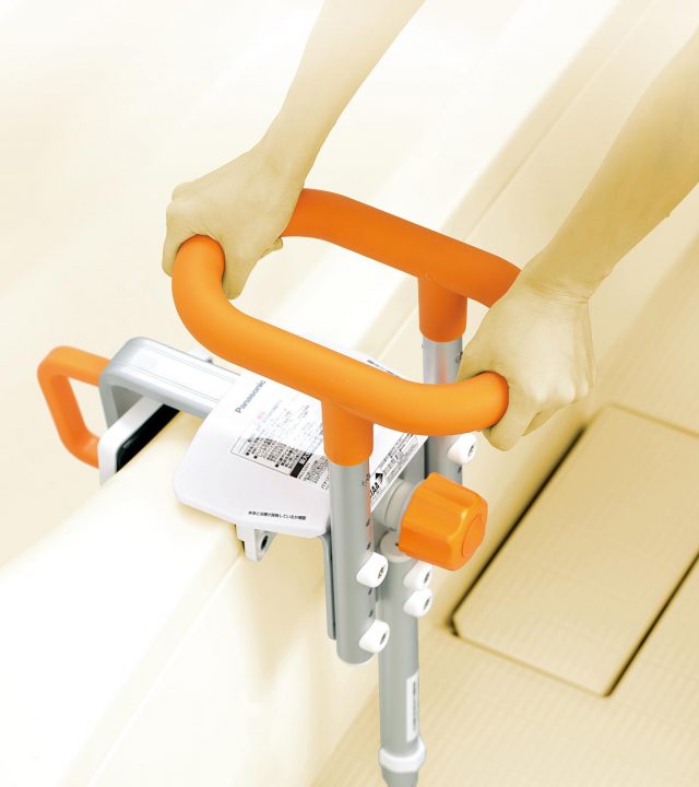 「200脚付き」には、独自の毘沙門亀甲柄(びしゃもんきっこうがら)の滑り止めを浴槽との接地面に採用することにより、従来手すりが設置できなかったフチが厚く湾曲した浴槽の端にも取り付けることができる。