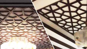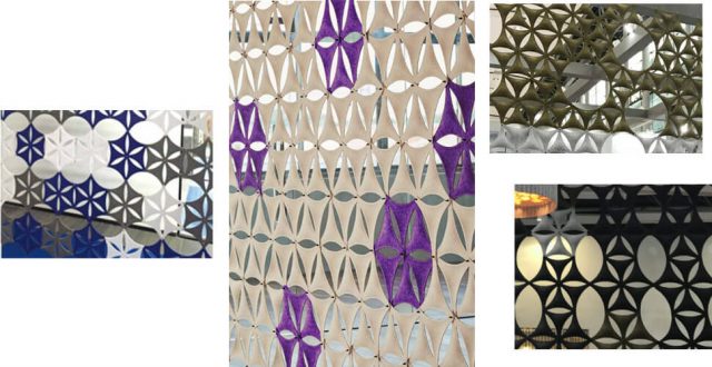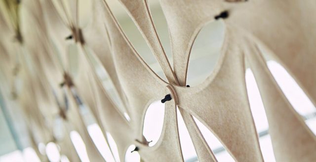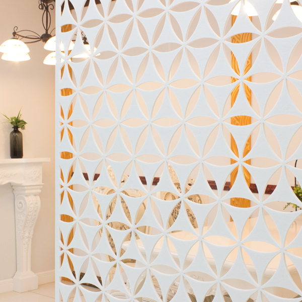 もう1つの大型シートタイプは、1200x2400mmのフェルトに幾何学的な切り抜き模様をつけたもの。天井から吊るすだけでパーティションとして使うことができる。