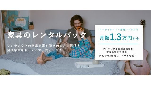 スペースエージェント(東京都渋谷区)は、同社のインテリアデザイナーがトータルコーディネートした家具家電パッケージを、格安料金でレンタルする民泊物件向けのサービス「家具のレンタルパック」を、4月26日から開始した。民泊に必要なリスティング映えを叶え、これから始める部屋の収益最大化を後押しする。