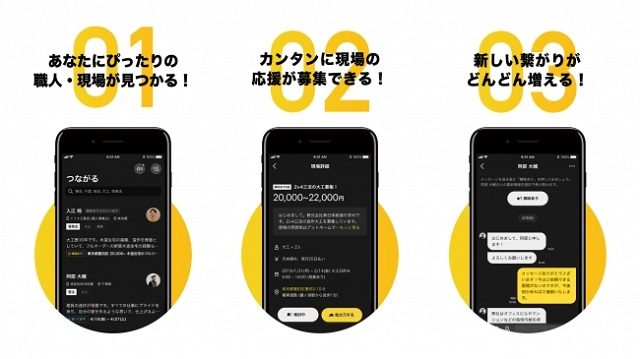 新しくなった同アプリでは、職種・居住地を入力するだけで、条件にあった職人や現場をすぐに見つけることが可能。現場情報を掲載して簡単に応援を募集することができ、仕事を探している職人は自分にあった現場に応募できる。いつでもだれとでもメッセージのやりとりができるため、情報を共有したり気になった受注者、発注者と新しいつながりをつくることができるという。