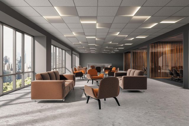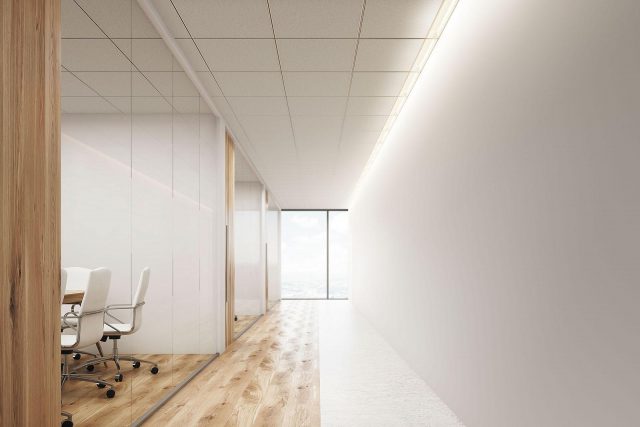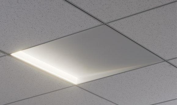 オフィス空間の共用部(受付、会議室、通路、フリースペース)の機能やイメージに合わせ、600グリッドのシステム天井に自由度の高い配置が可能な照明器具。導光パネルを採用することで天井に溶け込み、ツヤを抑えることで映り込みを減らした。