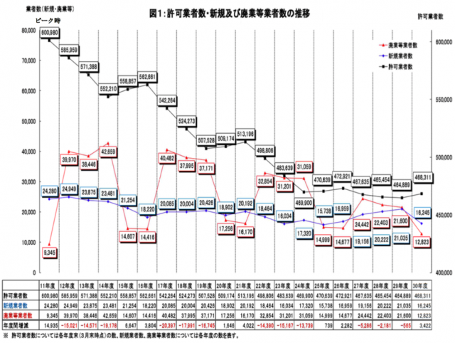 解体工事業の許可業者数は、2016年6月1日時点でとび・土工工事業の許可を受けている業者で、解体工事業に該当する事業を営んでいる場合、2019年5月31日までの間に限り、解体工事業の許可を受けずとも当該事業を営むことができることを受けて増加したとみられる。