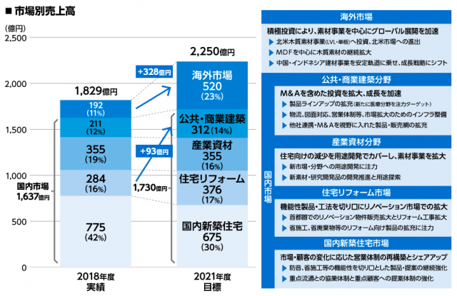 目標売上高の内訳は、国内市場1730億円(同+93億円)、海外市場520億円(同+328億円)。本格的な新築住宅市場の縮小が見込まれる国内では、重点市場・分野として「公共・商業建築分野」の売上高を1.5倍の312億円に、「住宅リフォーム市場」の売上高を1.3倍の376億円に拡大する。一方、海外市場の売上高シェアは11%から23%に高める。