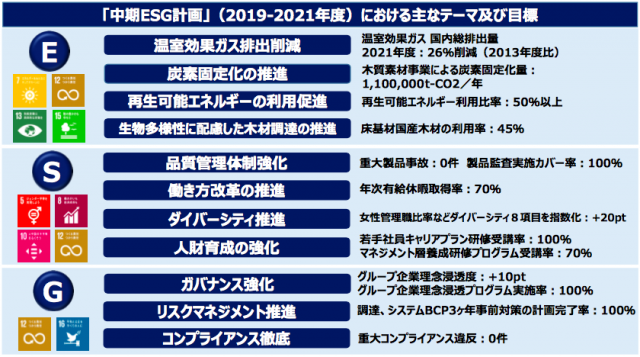 さらに、経営基盤強化のために特に重要な項目を 「中期ESG計画」として策定。2021年度に向けた目標を設定し、より連動性を高めて一体で取り組む。