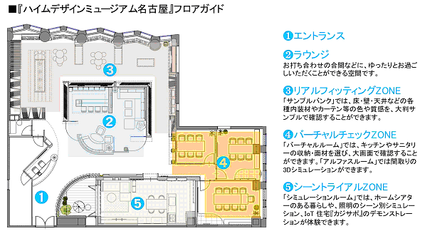 体感プログラムとして、多彩な大型サンプルでインテリアイメージを確認できる「リアルフィッティング」ゾーン、設備や間取りを大型画面や映像・CGで再現確認できる「バーチャルチェック」ゾーン、生活シーン別のライティングやIoT住宅を体感できる「シーントライアル」ゾーンを用意している。場所は、名古屋市東区東桜1-13-3(NHK名古屋放送センタービル10F)。