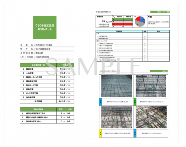 同サービスは、施工品質の基準書(標準施工手引書)を作成し、自社基準を満たしているかを、ネクストステージがクラウド上の写真を活用して評価、レポートを提出するというもの。レポート作成依頼から内容の確認まで、建築現場の情報・写真などを一元管理する「ダンドリワーク」内で完結するため、新システムを導入することなくサービスを利用することができる。