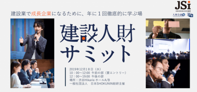 一般社団法人日本SHOKUNIN総研(東京都新宿区)は、建設業界の「人財課題」の解決を目的とし、2019年12月18日に日本初となる建設業界最大級の人財イベント「建設人財サミット」を渋谷ヒカリエにて開催する。
