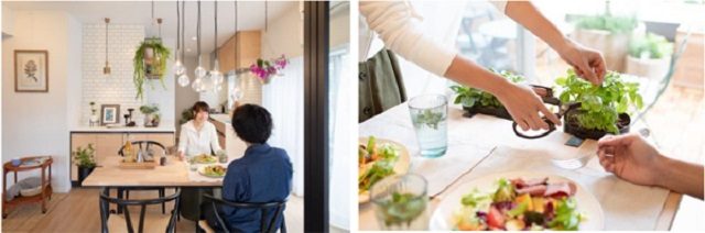 同物件では、リビングの天井に京金網「金網つじ」製のオリジナルプランターを吊り下げるなど、花や緑を取り入れたインテリアデザインを提供。引き渡しの翌月から1年間、サービスとして、花の特徴や飾り方を紹介するほか、季節の花のミニブーケが届けられる。