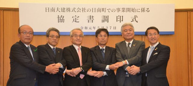 大建工業(大阪市北区)は5月27日、「日南町『木材総合カスケード利用』事業化検討プロジェクト」の事業化案件として、日南町森林組合(鳥取県日南町)、オロチ(同)、越井木材工業(大阪市住之江区)と合弁設立した「日南大建株式会社」の事業開始に係る支援協定を、鳥取県及び日南町と締結した。同日、鳥取県知事公邸で協定書の調印式を開催した。