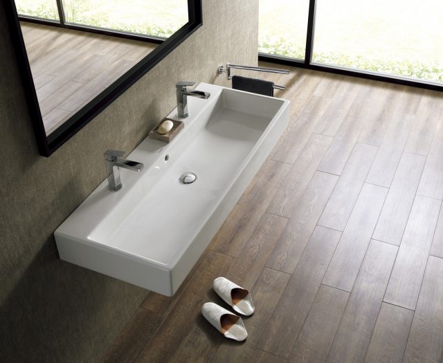 長方形のモダンなフォルムが特徴。1つの洗面ボウルに水栓を2本セットすることが可能で、水栓金具はインセットタイプのため、水じまい、清掃性にすぐれる。デュラビット社の洗面キャビネット「L-CUBEシリーズ」との組み合わせも可能。