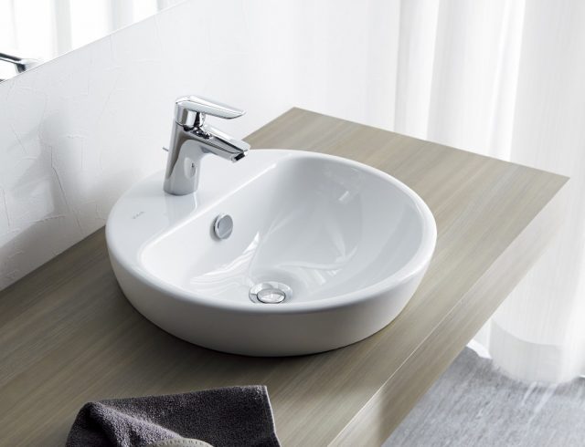 やわらかな曲線とほどよい厚みがあるベッセルタイプの洗面ボウル。水栓金具がインセットタイプなので、水じまいがいい。 445x450x深さ110mm。5万9000円。