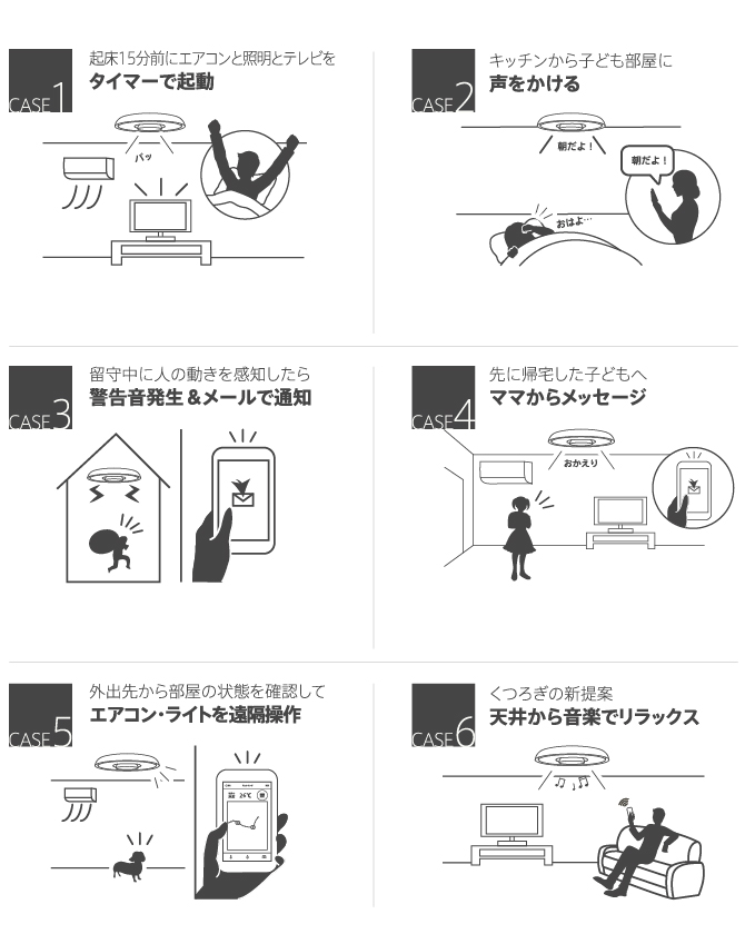 照明の真ん中に組み込まれているユニットには、照度、人感、温度、湿度の4つのセンサーや通信モジュール、スピーカーやマイクなどが内蔵され、音楽再生などのエンターテインメント、テレビやエアコンなどの家電を操作するスマートコントロール、スマホを利用した家族のコミュニケーションの主要3つの機能があります。