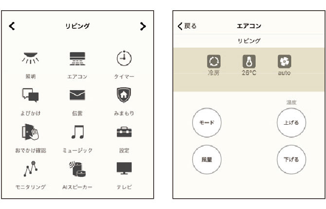 マルチファンクションライトを操作するアプリ 「MF light」のトップ画面と1例としてのエアコン操作の画面