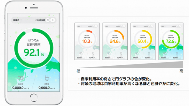 同サービスは、スマートフォンやタブレットから簡単に太陽光発電の自家利用状況を確認できるもの。太陽光の発電量、蓄電池への充放電量、売電量と家庭内電力消費量データをもとに、太陽光の自家利用率を表示する。加えて、これまでエコめがねで蓄積した5万件以上の発電量データと、利用者の消費パターンの予測や天候・気温データを活用し、蓄電池のAI制御を行う。