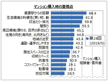マンション購入経験者・意向者に対して、マンション購入時の重視点を聞いたところ、「最寄駅からの距離」が68.4%で最多だった。次いで「生活環境の利便性(買い物、教育など)」「日当たり・採光」「間取り」が各6~7割で続いた。重視点の多くで女性の回答数が男性を上回り、「日当たり・採光」「住居の向き(南向き、北向きなど)」「地域の治安」「間取り」「収納スペース」などは特に男女差が大きくなった。