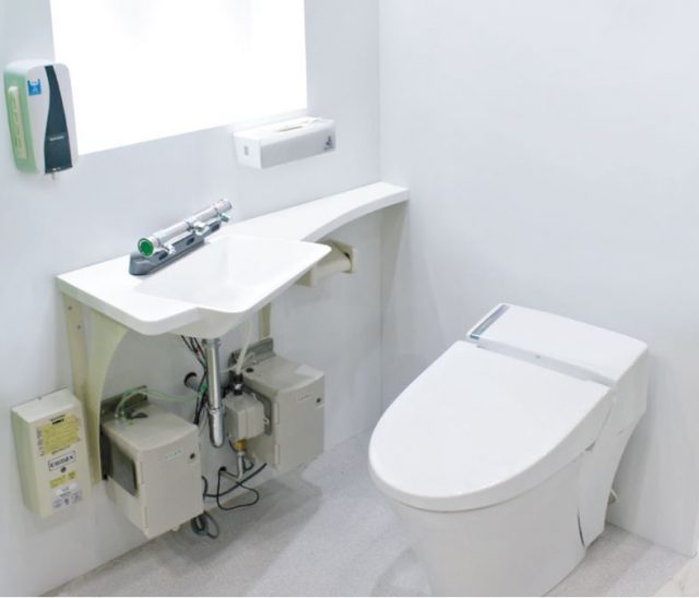 新商品は、手洗いの新ルールだという「脱いだまま手洗い」を可能にする、トイレ個室内専用の手洗い。衣服を下げ、用を足し、便座に座った状態で手洗いができるため、衣服・ドアノブへの汚染を防ぐことができる。