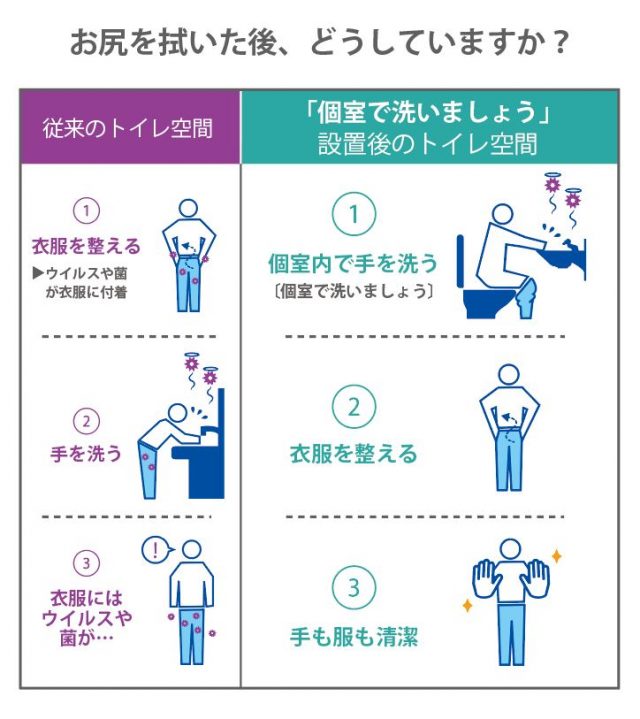 飲食店・学校給食などで発生する細菌感染や食中毒の多くは、不完全な手洗い設備が影響しているという。とくに用便後の手指が汚染源となり、衣類やドアノブにウイルスが付着、トイレの外にウイルスを持ち出してしまうケースが多いようだ。