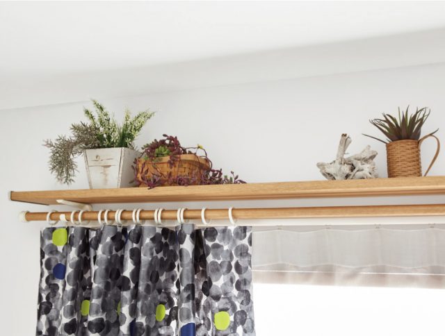 もう1つの「ヴィンクスシェルフ」は、デッドスペースだったカーテンレールの上に棚板を付けてインテリアスペースとして活用するもの。棚板にはブラケットピッチ間で5kgまでモノが載せられる。