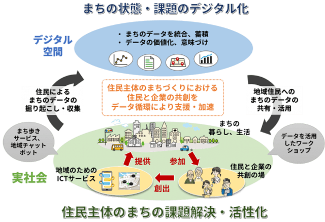 まちに関するデータを活用し、地域住民が主体となって課題解決に向けた取り組みを行うことを支援・加速する仕組みで、住民主体の活動を生み出す効果や、データの活用によって住民の議論が活性化する効果などを検証するというもの。