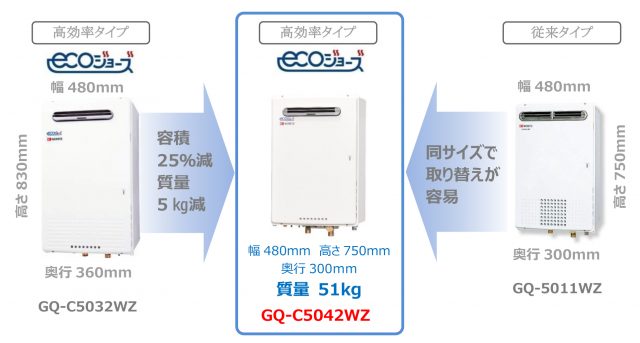 高効率タイプは、排気熱を回収する2次熱交換器を内蔵するなど構造が複雑なため、従来タイプよりも大型化する傾向にあるが、新商品は容積を25%削減して従来タイプ(GQ-5011WZ)と同サイズ(幅480x高750x奥行300mm)とした。