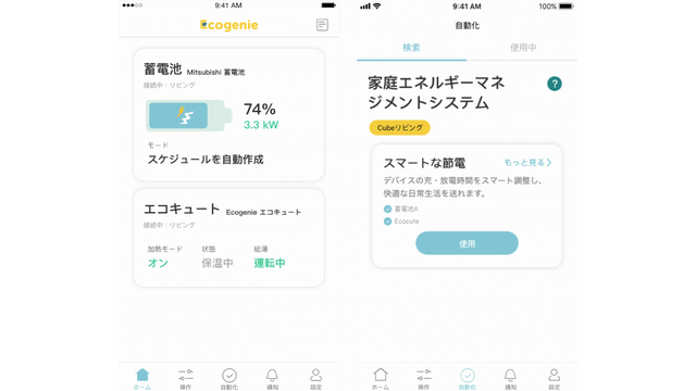 工事は不要で、専用アプリを通して利用ができる。アプリに、同社が提供するHEMSゲートウェイのCubeと蓄電池を追加し、「ワンタップ節電」を選択することで自宅の蓄電池をスマート化する。各メーカーの蓄電池に対応しており、月額利用料は無料。スマートメーターとの接続もできるという。
