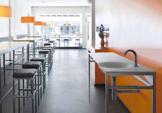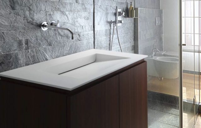 今回は「タニオリ」「ガーレ」「アラン」の3タイプをラインアップした。 「タニオリ」はスリットから排水するデザインの壁給水専用の洗面カウンター、「ガーレ」はカウンターとボウルをゆるやかな曲線で一体成形した小型手洗いカウンター、「アラン」はボウル手前をカットしたデザインの脚金物付き手洗いカウンター。